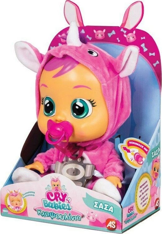 AS Κούκλα Κλαψουλίνια Sasha Τα κλαψουλίνια είναι τα πιο κλαψιάρικα μωρά. Αν τους βγάλεις την πιπίλα, αρχίζουν να γκρινιάζουν και κλαίνε με αληθινά δάκρυα! Η Σάσα, ένας γλυκός ρινόκερος, αγαπά τα πάρτυ γενεθλίων και τρελένεται να επιλέγει τα πιο τέλεια δώρα για τους φίλους της.