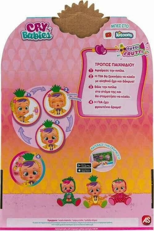 Κλαψουλίνια Tutti Frutti Πία Τα Cry babies είναι τα πιο κλαψιάρικα μωράκια! Εάν τους βγάλεις την πιπίλα, αρχίζουν να κλαίνε με αληθινά δάκρυα και γκρινιάζουν! Μεταφερθείτε στην παραλία Tutti Frutti και ανακαλύψτε τους νέους χαρακτήρες με το φρουτένιο άρωμα!