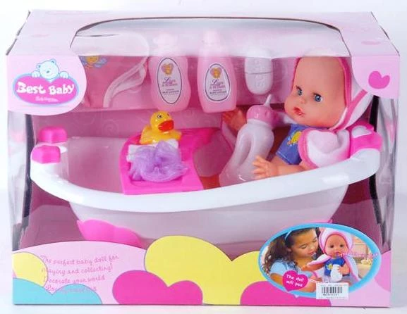 Κούκλα μωρό με μπανιερό και μπιμπερό 14″ Doll with Feeder. Το μωράκι θα πιει το γαλατάκι του και θα κάνει “πιπί”. Περιέχει πλαστικά μπουκάλια για να προσθέσετε το αφρόλουτρο, σαπουνάκι και πάνα για να το “αλλάξετε”. Μήκος μπανιέρας: 37 εκατοστά