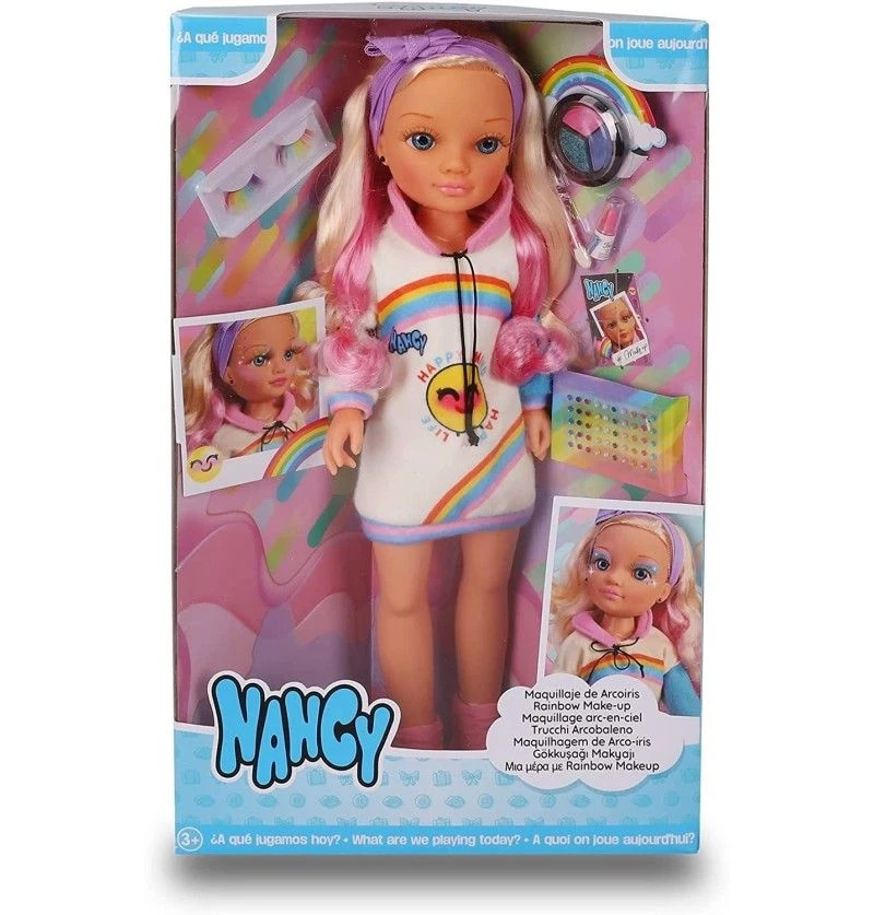 Μακιζιάζ Ουράνιο Τόξο Nancy Η Νάνσι είναι έτοιμη για μια αλλαγή με τις βλεφαρίδες του ουράνιου τόξου. Περιλαμβάνει πολλά αξεσουάρ για να φτιάξετε διαφορετικούς τύπους μακιγιάζ. Mια παλέτα σκιάς ματιών με πινέλο, κραγιόν, πολύχρωμες ψεύτικες βλεφαρίδες και μερικά φωτεινά αυτοκόλλητα διαφορετικών χρωμάτων για να διακοσμήσετε το πρόσωπο. Η Νάνσι φοράει…