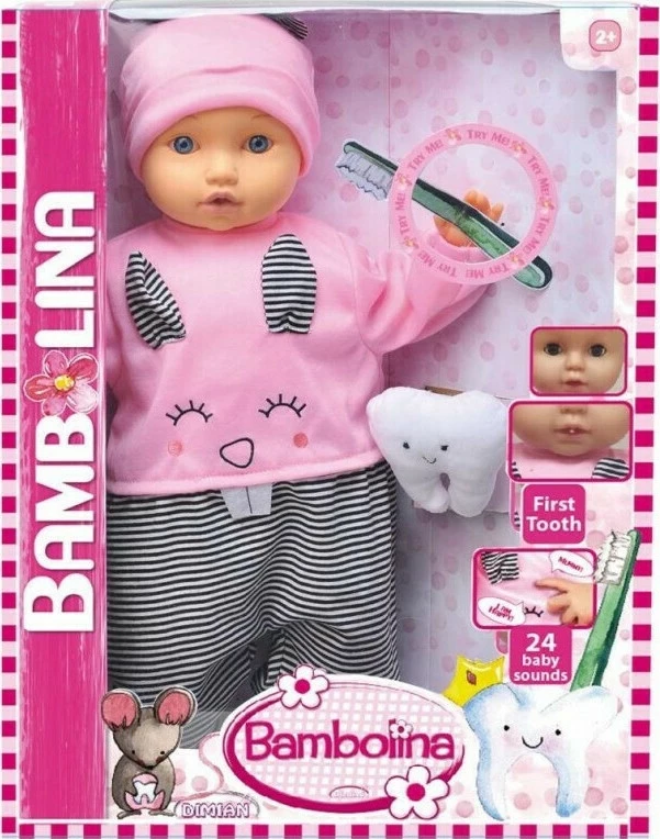 Κούκλα Bambolina 46εκ Το Πρώτο Μου Δοντάκι H Bambolina βγάζει το πρώτο της δοντάκι! Της πατάς το χεράκι και θα βγει το πρώτο της δοντάκι. Πάτησε το στήθος της για να ακούσεις 24 διαφορετικούς ήχους! Κούκλα 46εκ. με αξεσουάρ.